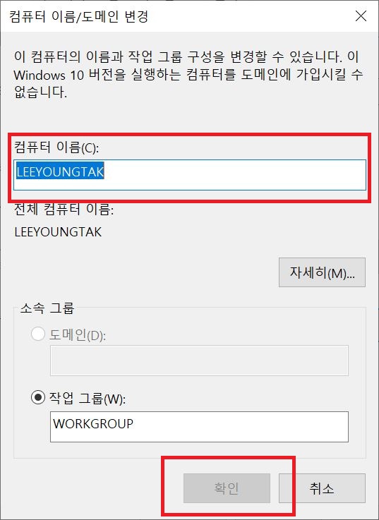 4. 그러면 여기에서 컴퓨터 이름을 정할 수 있습니다. 여기 컴퓨터 이름은 특수문자, 뛰어쓰기가 모두 불가능하고 대신 소문자와 대문자는 구분해서 사용할 수 있습니다. 다 정하셨다면 아래 확인을 눌러주시면 컴퓨터를 재부팅하게 되고 설정이 적용되게 됩니다.