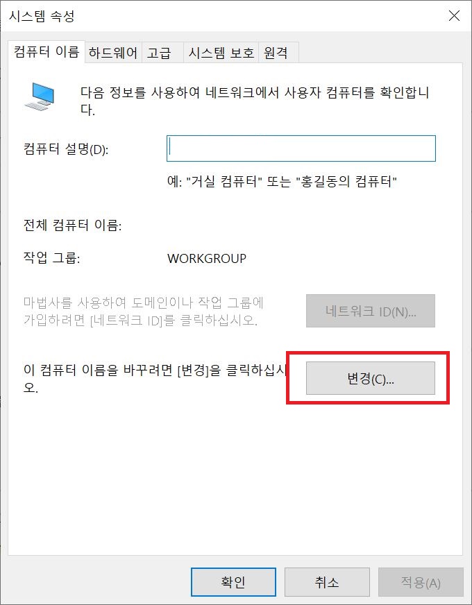 3. 그러면 컴퓨터의 설명을 우선 정할 수 있습니다. 아래 예시를 통해서 간단히 컴퓨터를 설명할 수도 있고 그냥 이름을 써주셔도 됩니다. 여기 컴퓨터 설명은 뛰어쓰기도 가능하고 제약이 별로 없습니다. 마지막으로 이름을 변경하시려면 아래 '변경'을 클릭해 주세요.