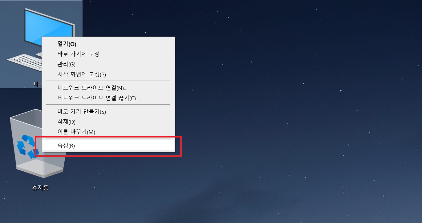 1. 우선 바탕화면의 내 PC를 마우스로 우클릭 후 '속성'으로 들어가 주세요. 바탕화면에 내 PC가 없고 내 PC, 휴지통, 네트워크, 제어판 등의 아이콘들을 생성하고 싶으시다면 여기를 클릭하시면 관련 글로 이동됩니다.